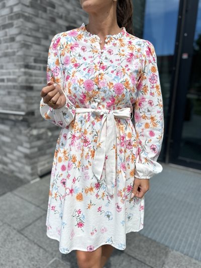 Denne elegante kjole fra VILA kombinerer feminin stil med komfort. Det smukke blomsterprint giver et let og romantisk udtryk, mens de fine knapper foroven tilfører et klassisk touch. Kjolen har en elastikkant ved ærmerne, som skaber en flot pasform, og et bælte i taljen, der fremhæver figuren på en elegant måde. Det løse fald forneden gør kjolen behagelig at have på og giver et let og luftigt look.
