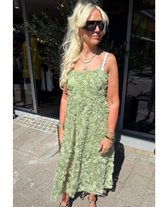 Elegant og feminin kjole i en fortryllende grøn farve. Kjolen er udsmykket med et smukt 3D blomsterprint, der tilføjer tekstur og et romantisk udtryk. Den har en let underkjole for ekstra komfort samt spaghettistropper, der giver et let og luftigt look. Lukkes diskret med lynlås i siden. Perfekt til sommerens fester eller som gæstekjole til særlige anledninger.