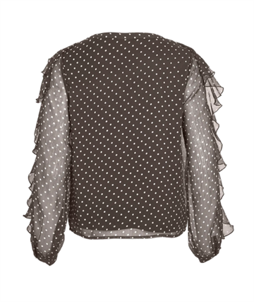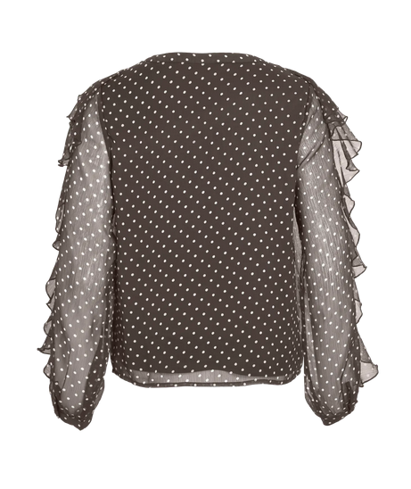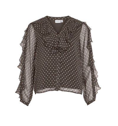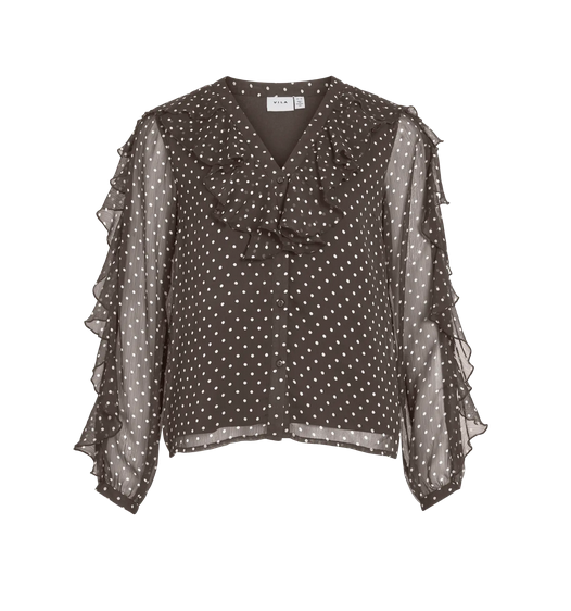 Opgrader din garderobe med denne feminine og legende HARLEY langærmede top fra VILA. Toppen har et smukt, chokoladebrunt polkaprint, der tilfører et klassisk men moderne udtryk. De lette, transparente ærmer med bløde flæsedetaljer skaber et elegant og luftigt look, du kan style både til hverdag og fest.