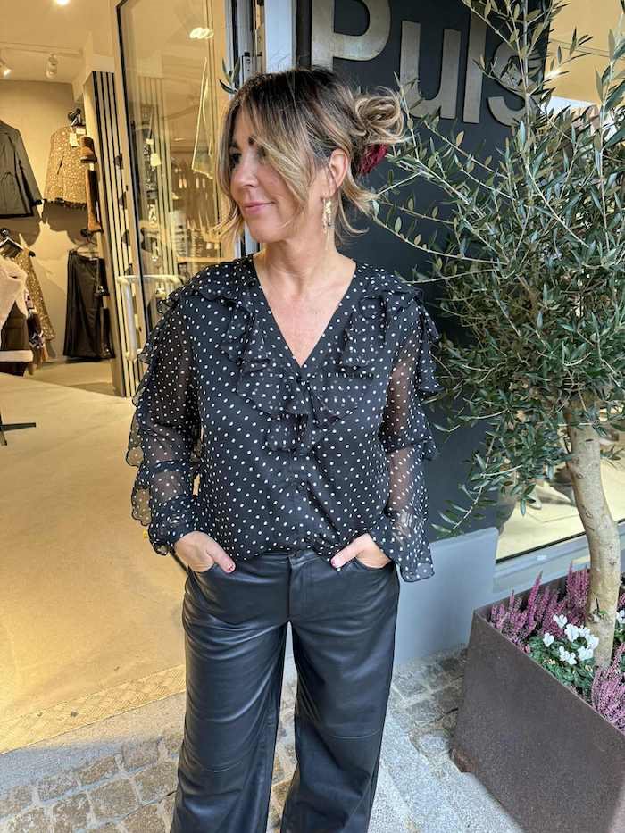 Denne feminine bluse er designet i let chiffon med et smukt prikket mønster og flæser foran og langs ærmerne, som giver et romantisk og sofistikeret udtryk.