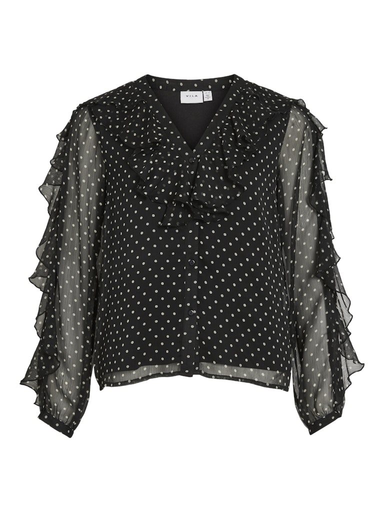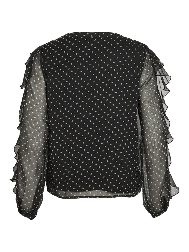 VIHARLEY L/S Top – Sort Prikket Chiffonbluse med Flæser fra VILA