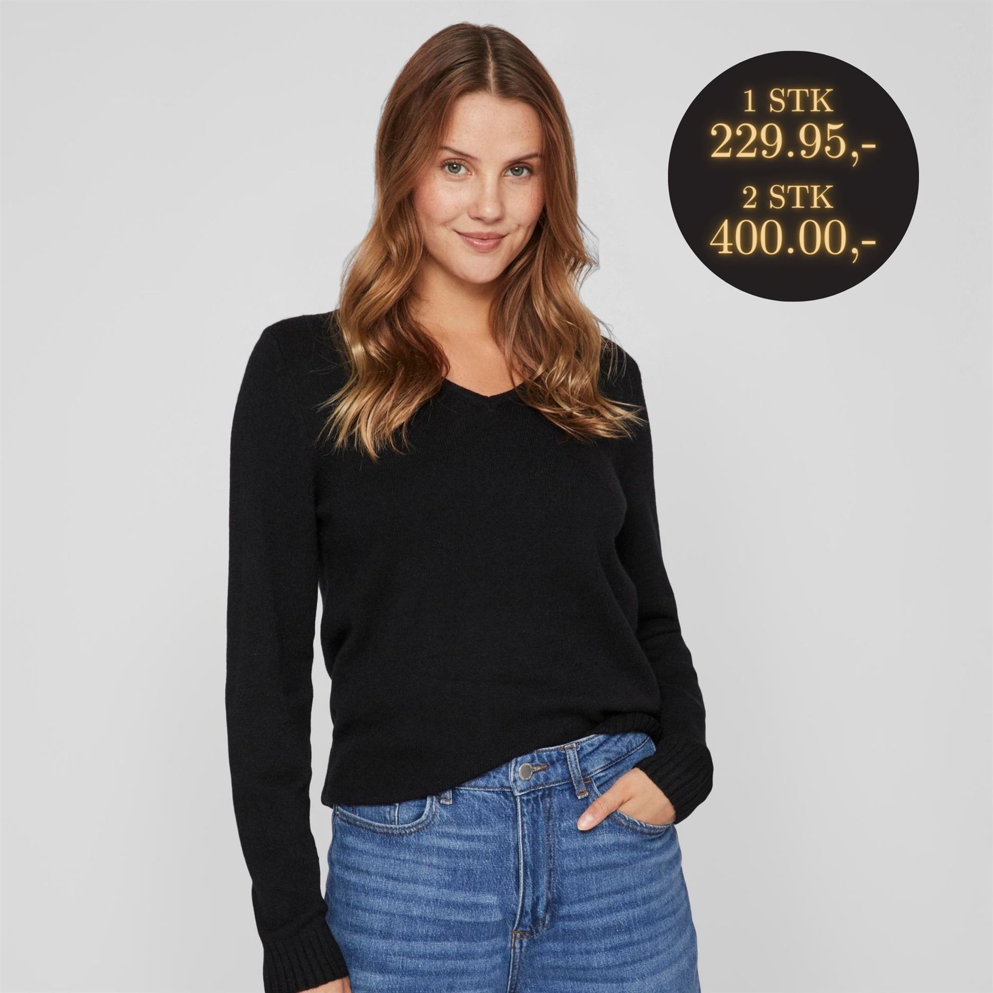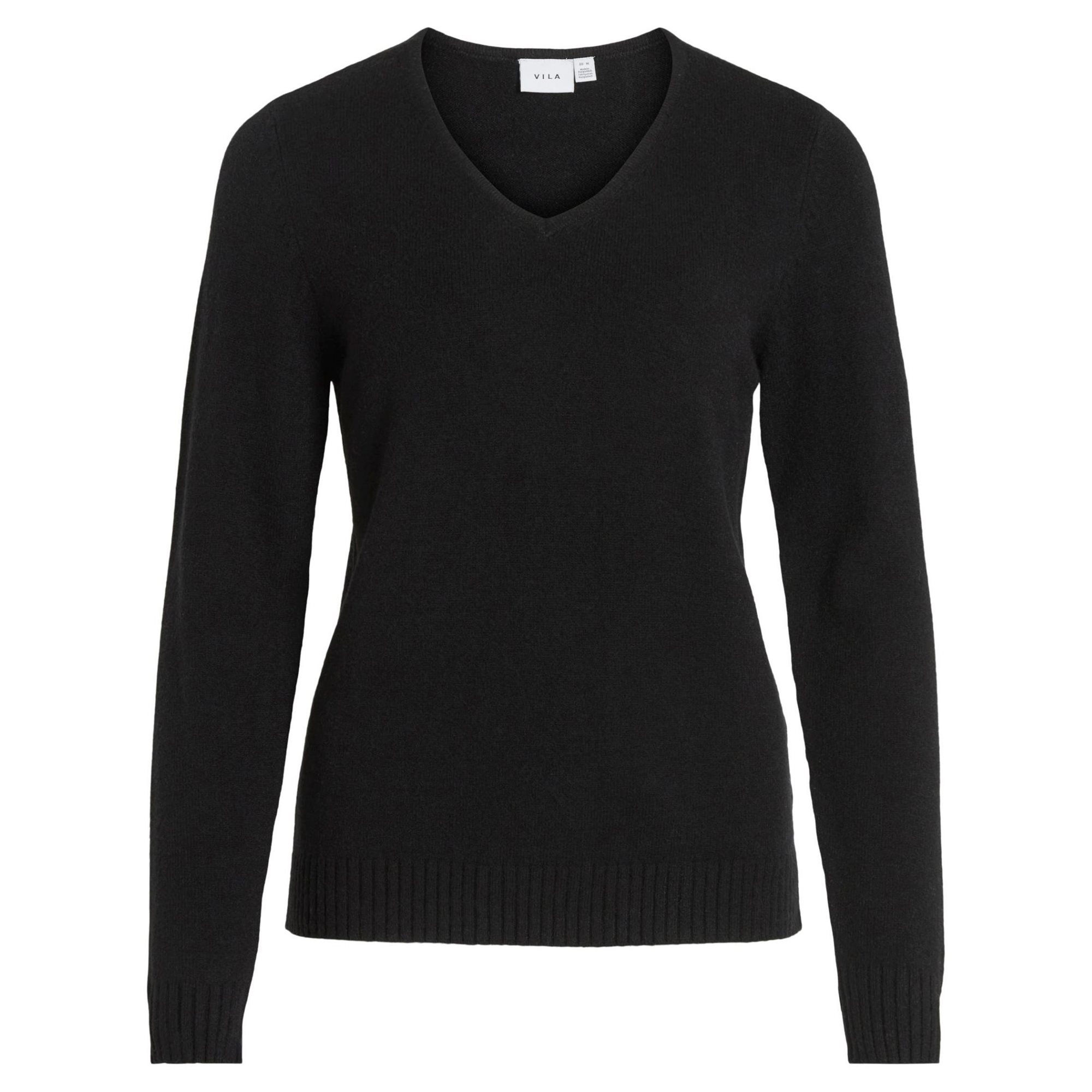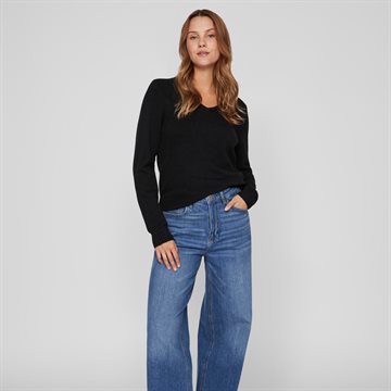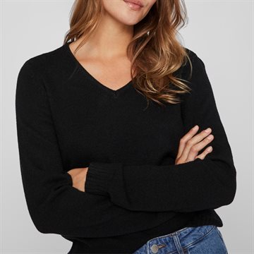 Endnu en skøn nyhed fra Vila. Pullover med v udskæring, samt lille ribkant ved hals, ærmer og forneden, blød og lækker kvalitet. Sort.