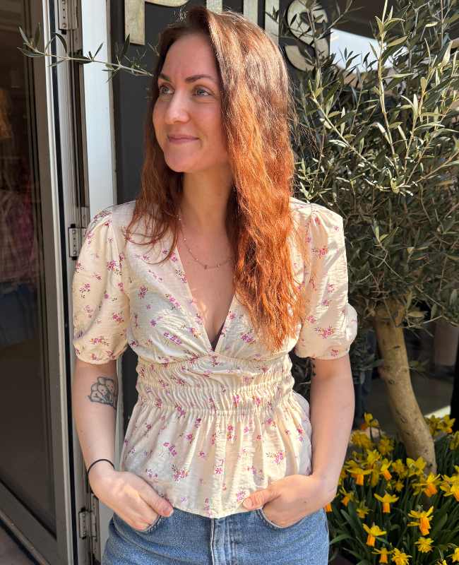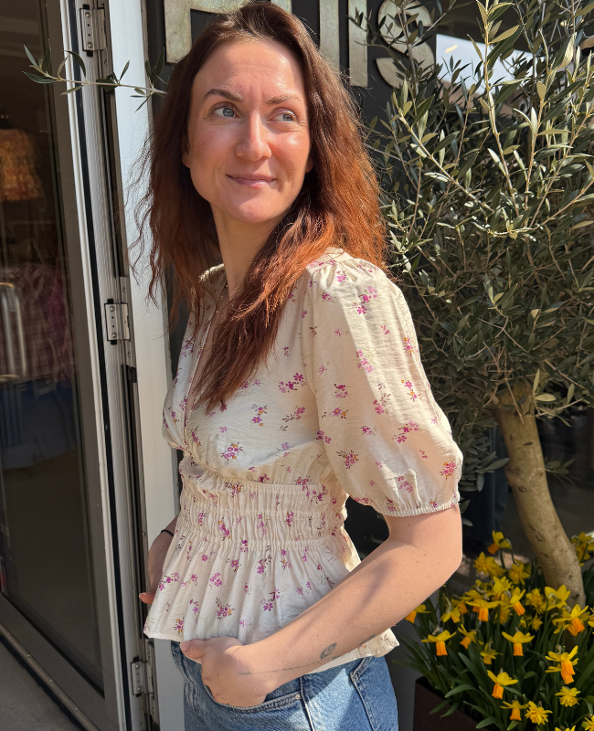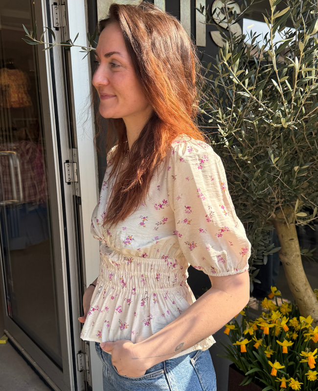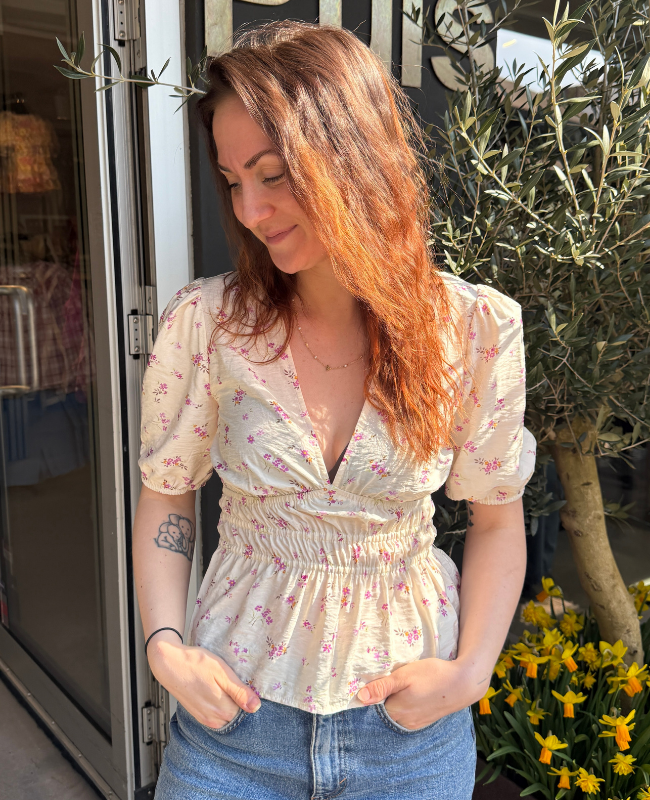 Denne fine top er designet med et smukt blomsterprint, der giver et let og romantisk udtryk. Den dybe V-udskæring fremhæver en feminin silhuet, mens smock-detaljen i taljen skaber en flatterende pasform.