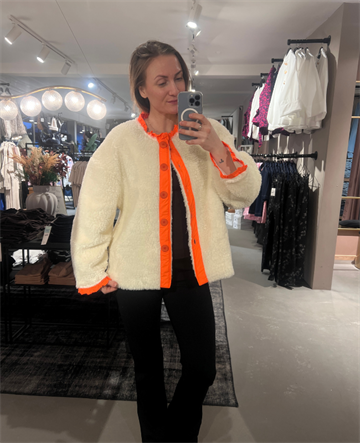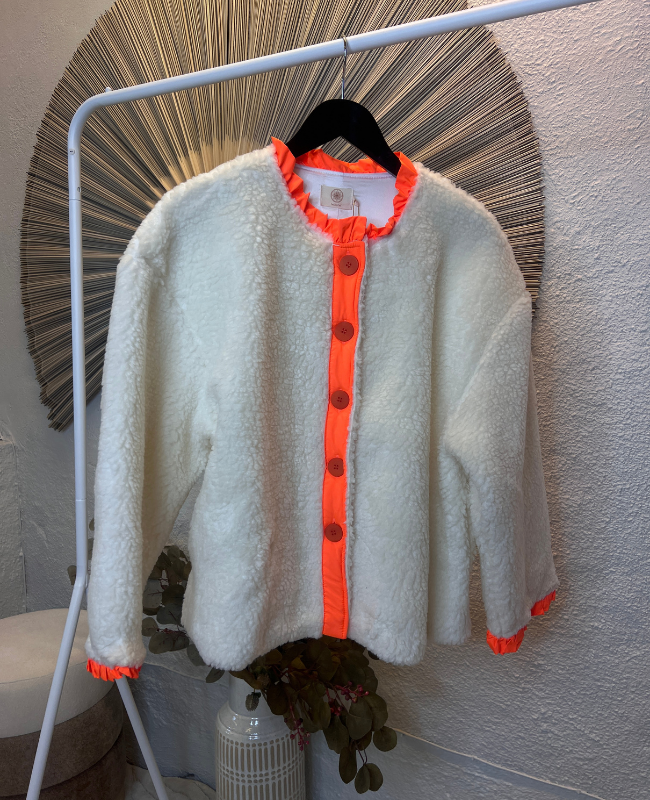 Frida Fleece fra WAUW er en iøjnefaldende og stilfuld fleecejakke i en blød off-white teddy-kvalitet med markante neonfarvede kontrastdetaljer. Kombinationen af det rolige grundudtryk og de klare neonkanter giver jakken et moderne og legende look.