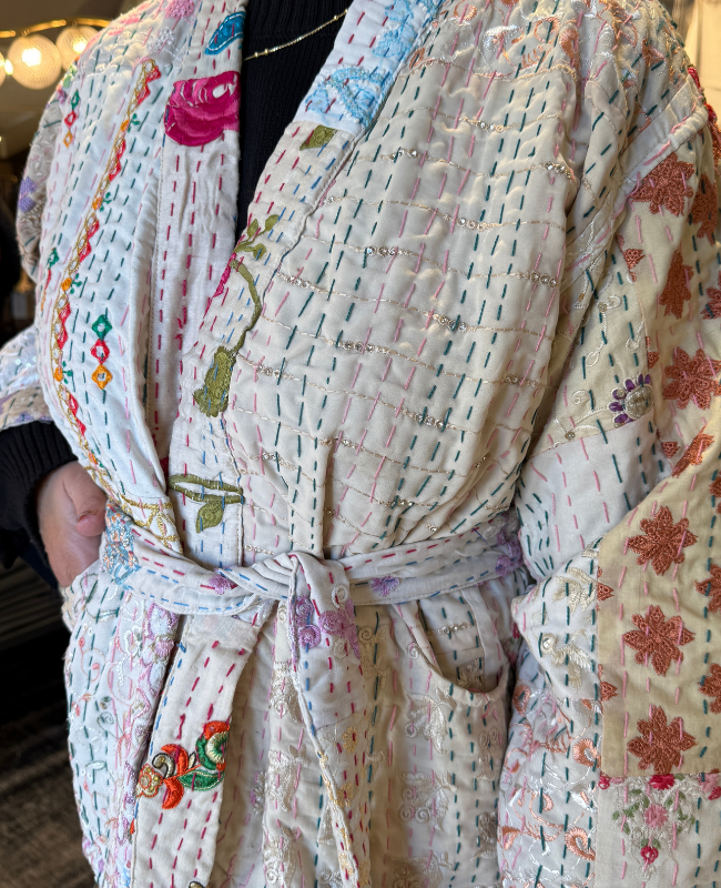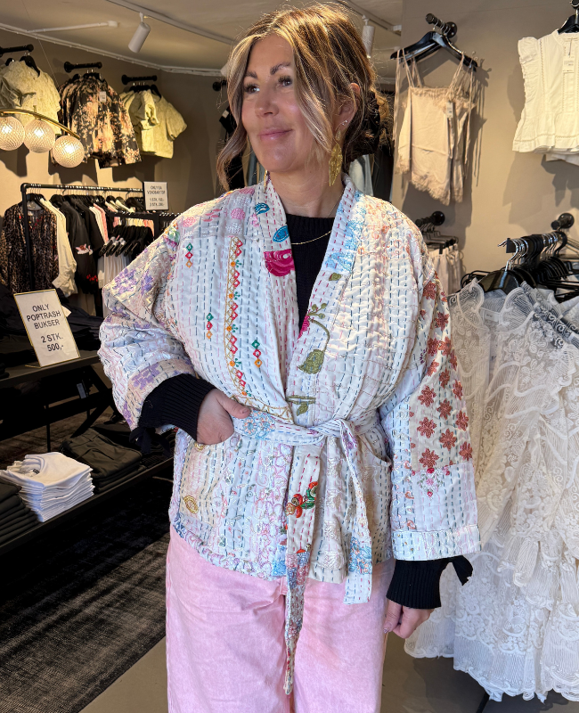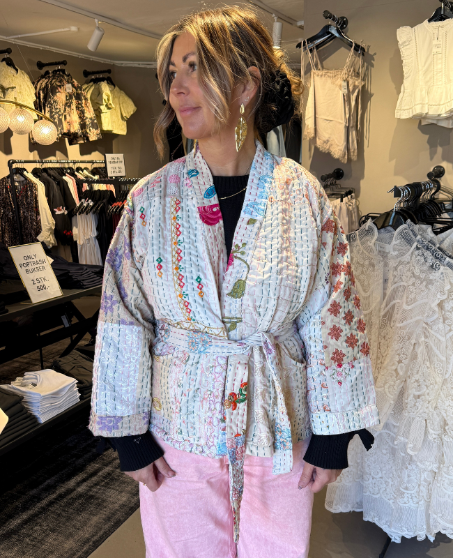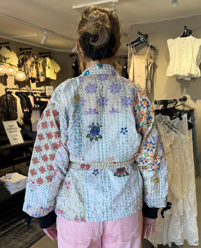 Giv dit outfit et kunstnerisk og unikt udtryk med denne super fede quilted jakke fra Wauw. Jakken er fremstillet i 100% bomuld og designet i en smuk cremefarvet bund med et væld af farverige broderier, dekorative sten og fine patches. Hver jakke er helt unik – ikke to er ens, hvilket gør den til et særligt statement piece i garderoben.