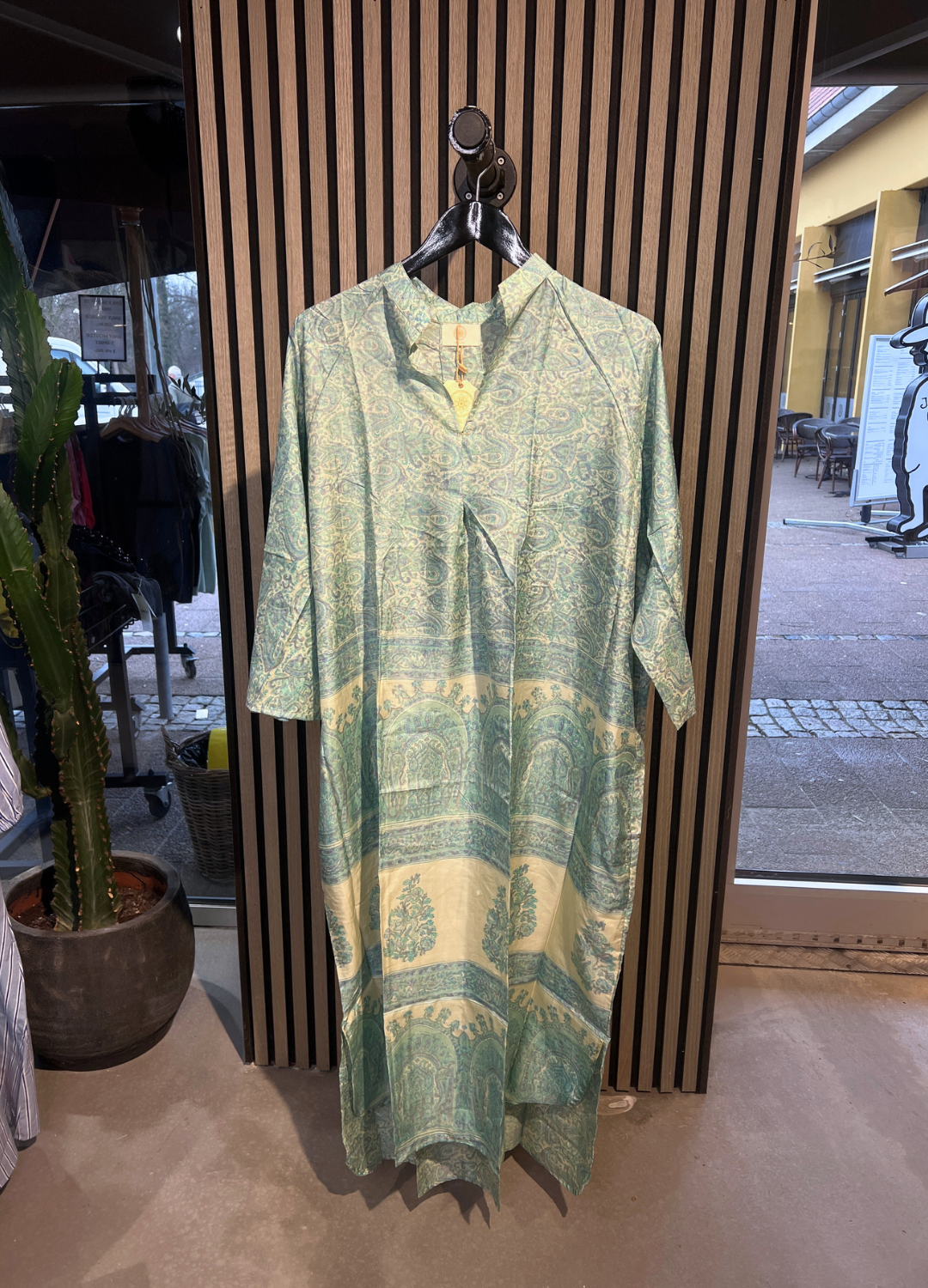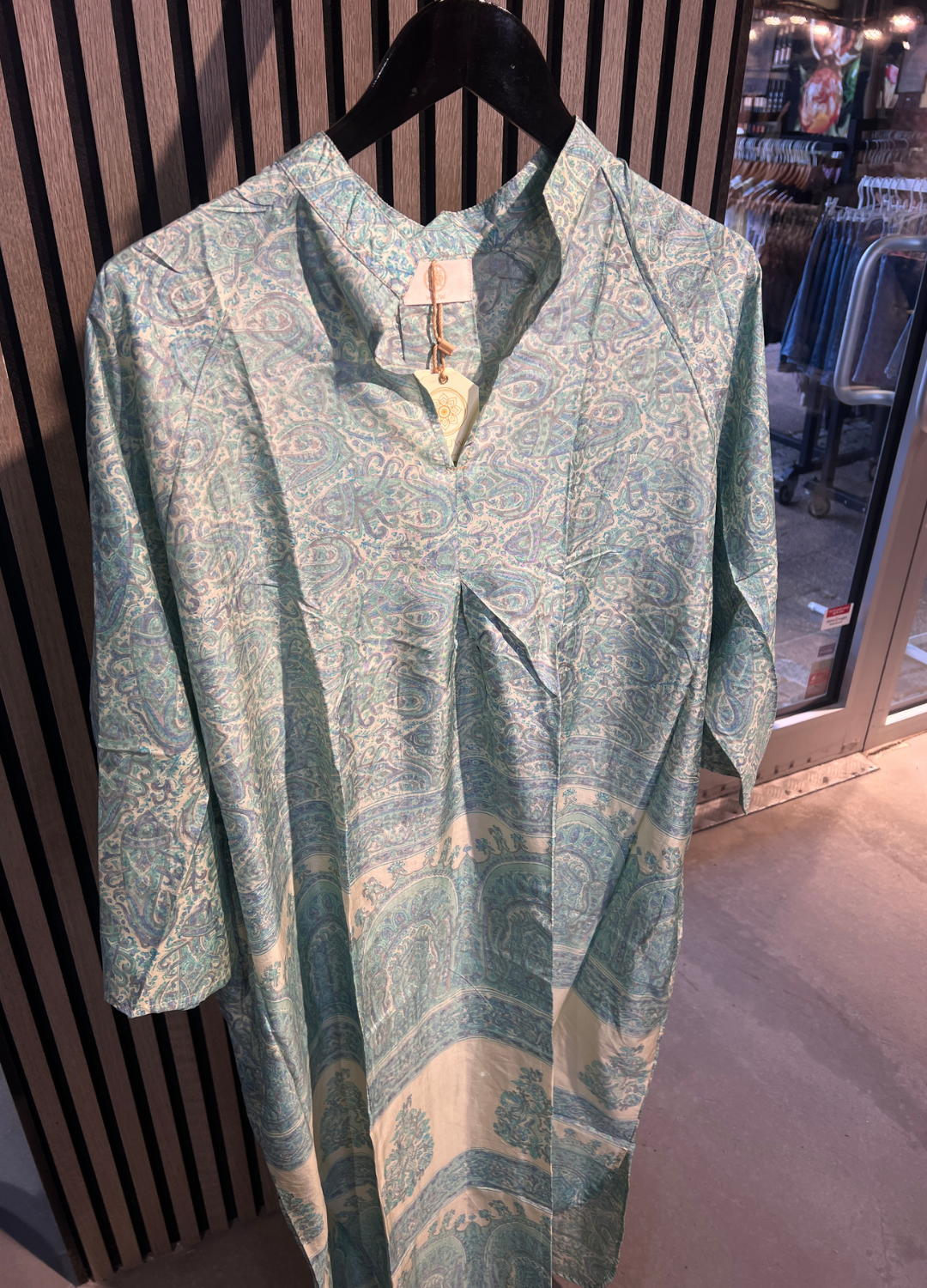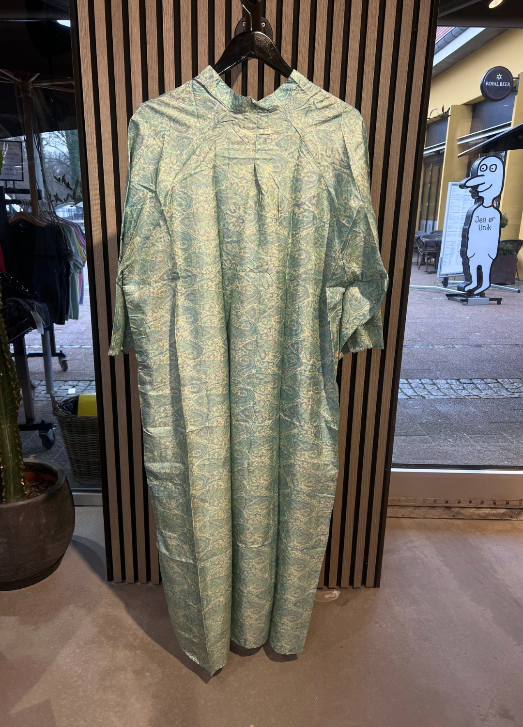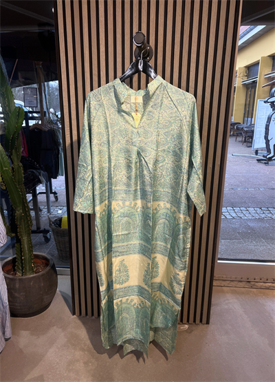 Denne smukke kaftan er fremstillet i silkeblødt materiale med farverige og kunstneriske prints, der giver et luksuriøst og personligt udtryk. Hver kjole er unika, hvilket gør den til et helt særligt statement-piece i garderoben.