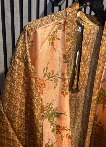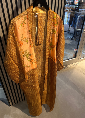 Denne lange kimono er fremstillet i silkeblødt materiale med smukke, farverige prints og unikke detaljer, der giver et luksuriøst og personligt udtryk. Hver kimono er helt unik, hvilket gør den til et særligt statement-piece i garderoben.