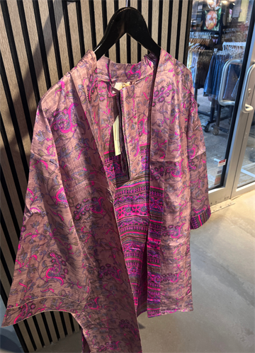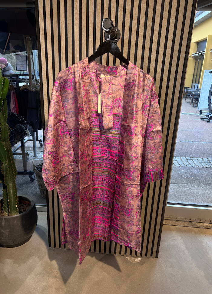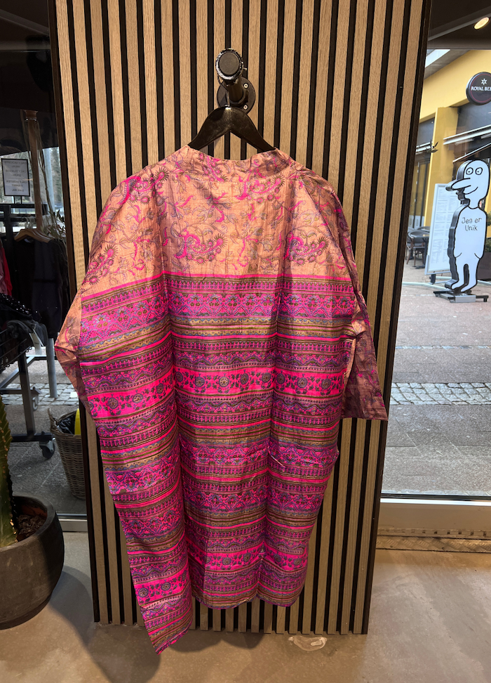 Denne kortere model er fremstillet i silkeblødt materiale med smukke, farverige prints og unikke detaljer, der giver et luksuriøst og personligt udtryk. Hver kimono er helt unik, hvilket gør den til et særligt statement-piece i din garderobe.