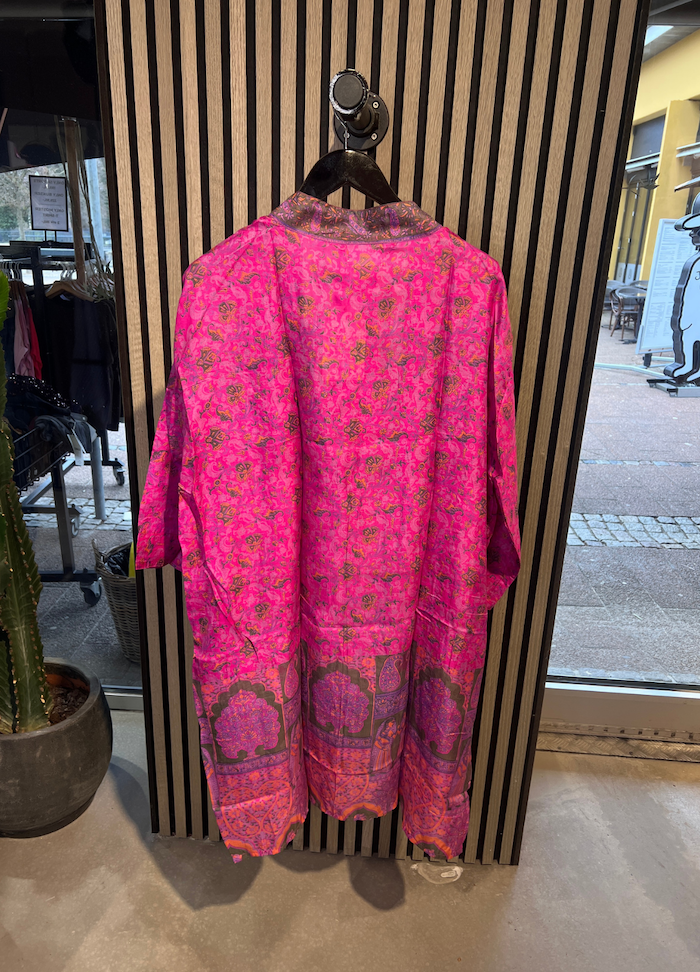 Denne kortere model er fremstillet i silkeblødt materiale med smukke, farverige prints og unikke detaljer, der giver et luksuriøst og personligt udtryk. Hver kimono er helt unik, hvilket gør den til et særligt statement-piece i din garderobe.