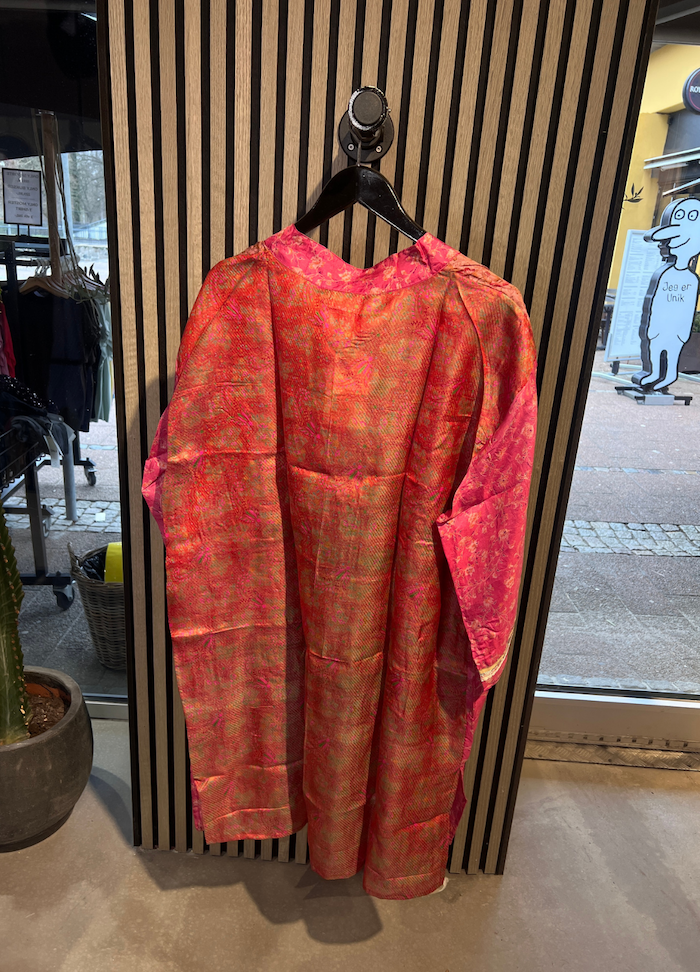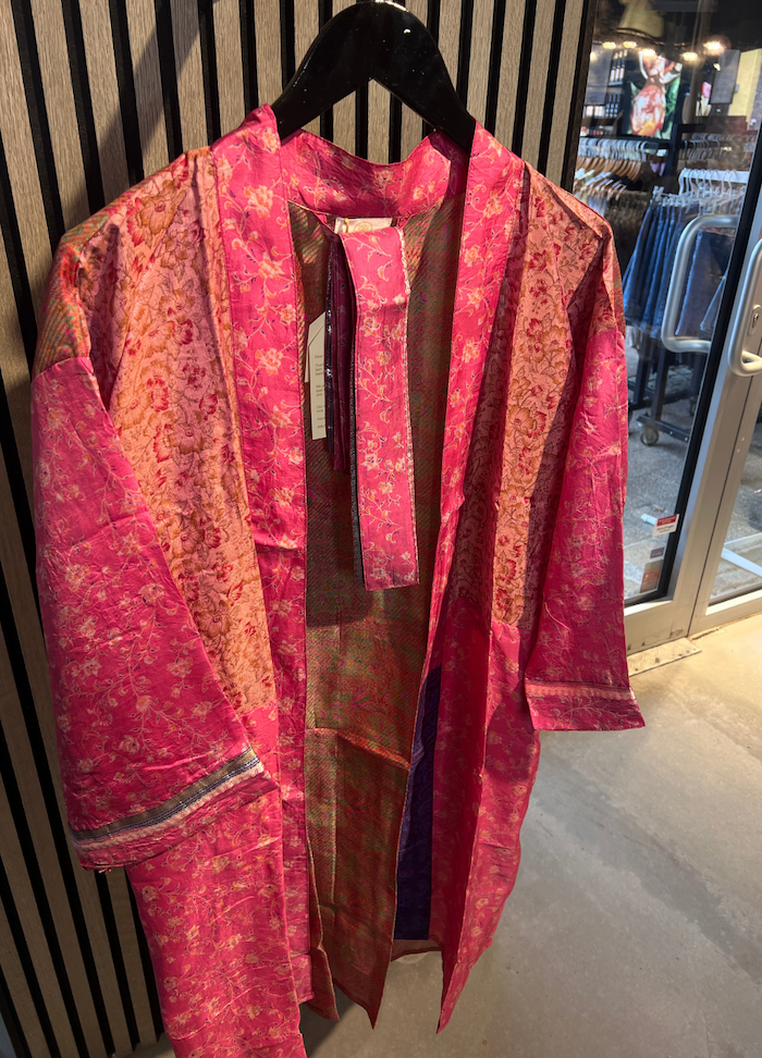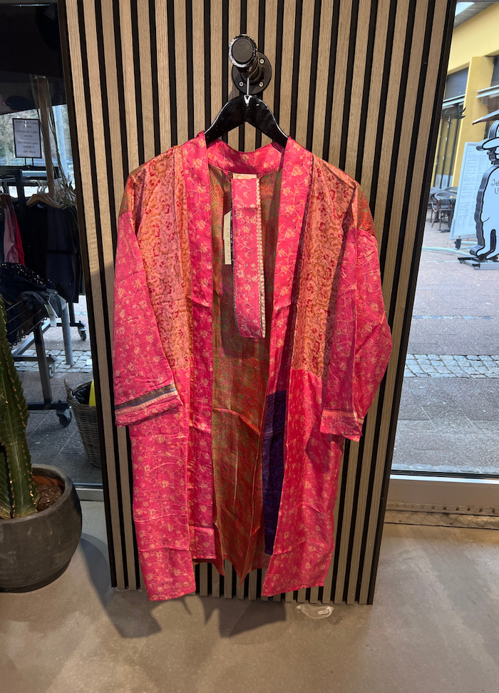 Denne kortere model er fremstillet i silkeblødt materiale med smukke, farverige prints og unikke detaljer, der giver et luksuriøst og personligt udtryk. Hver kimono er helt unik, hvilket gør den til et særligt statement-piece i din garderobe.