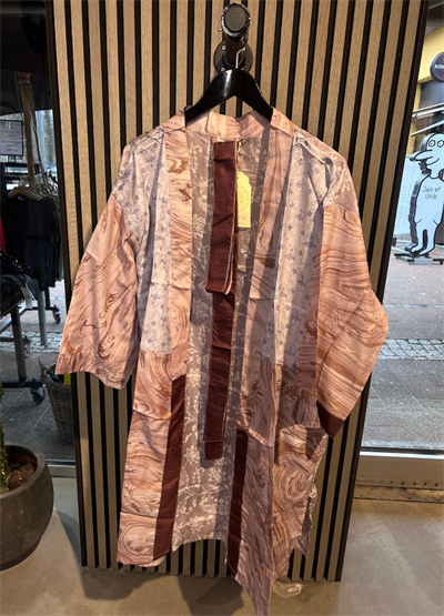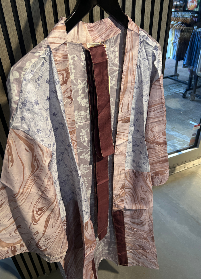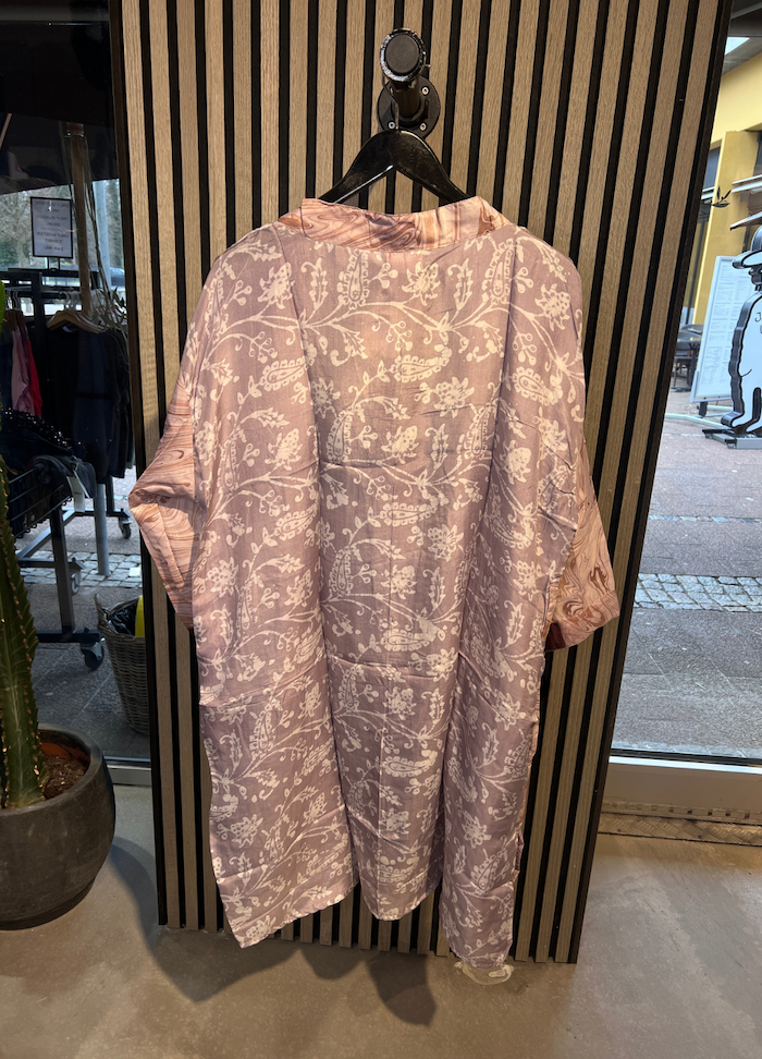 Denne kortere model er fremstillet i silkeblødt materiale med smukke, farverige prints og unikke detaljer, der giver et luksuriøst og personligt udtryk. Hver kimono er helt unik, hvilket gør den til et særligt statement-piece i din garderobe.