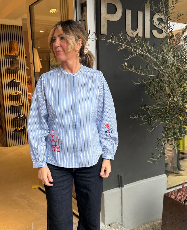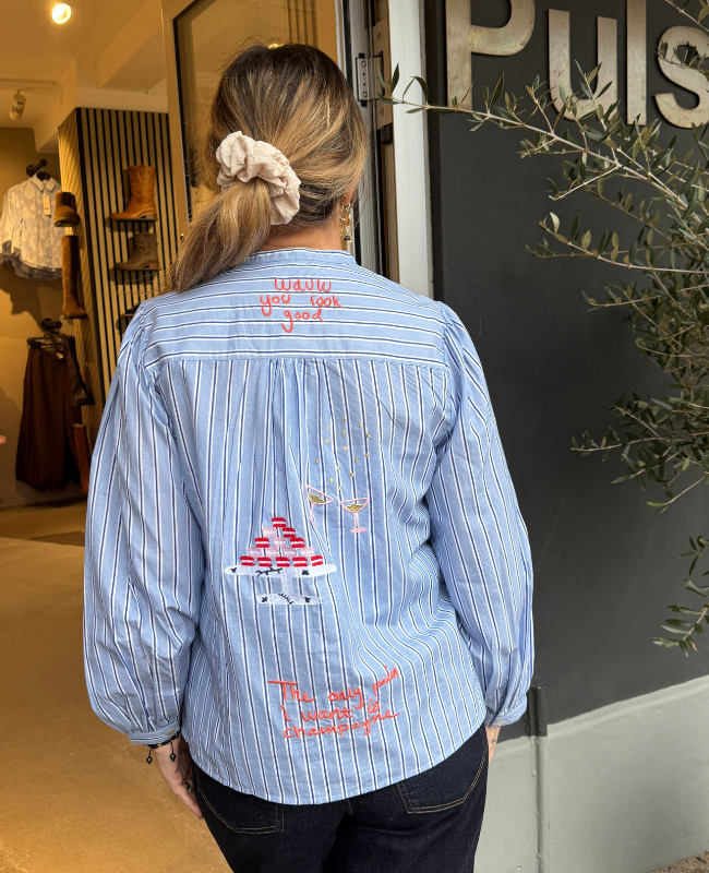 Designet har et klassisk blå- og hvidstribet mønster, som kombineres med kreative broderede detaljer. På skjorten finder du små motiver af champagneglas og festlige elementer, der giver et legende og eksklusivt udtryk. På ryggen er der desuden broderet teksten “Wauw you look good” og “The only thing I want is champagne”, som gør skjorten ekstra karakteristisk.