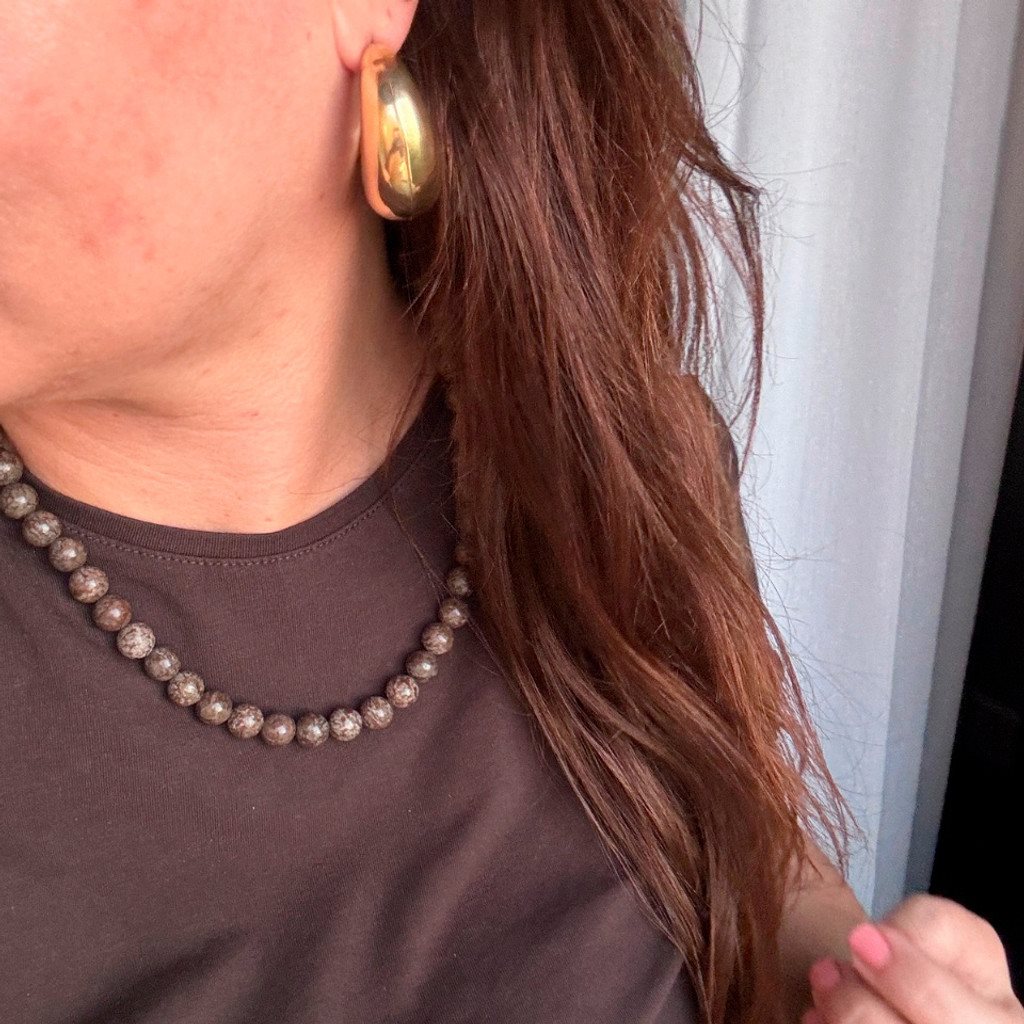Smuk og iøjnefaldende perlehalskæde fra Wolff Jewelry med store 10 mm natursten, der giver et eksklusivt og elegant udtryk. De varme brune nuancer skaber et naturligt og stilfuldt look, som passer perfekt til både hverdag og festlige anledninger.