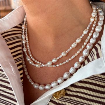 Elegant og tidløs perlehalskæde med smukke 3–4 mm hvide risperler, der giver et feminint og klassisk udtryk. De små naturlige perler skaber et fint og delikat look, som passer perfekt til både hverdag og festlige anledninger.