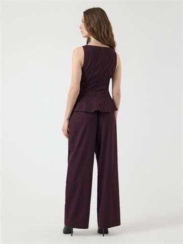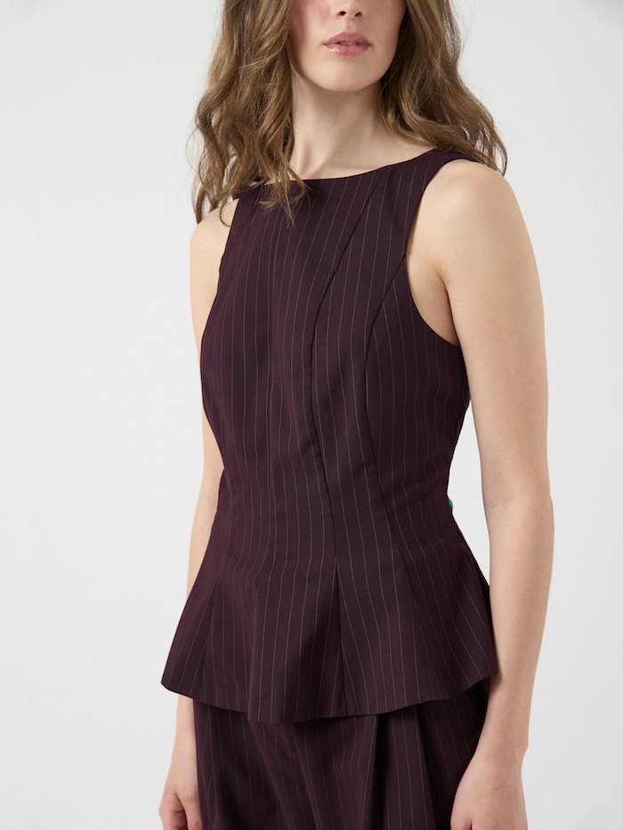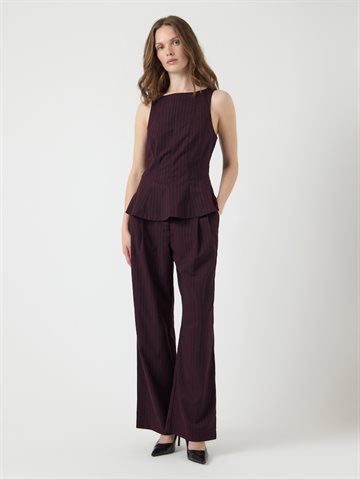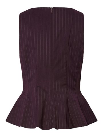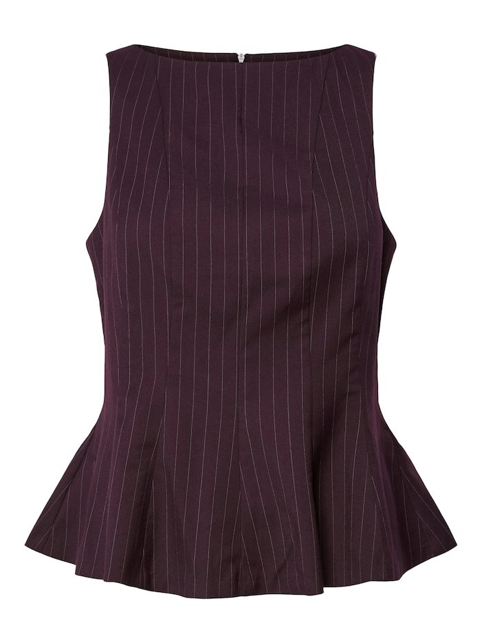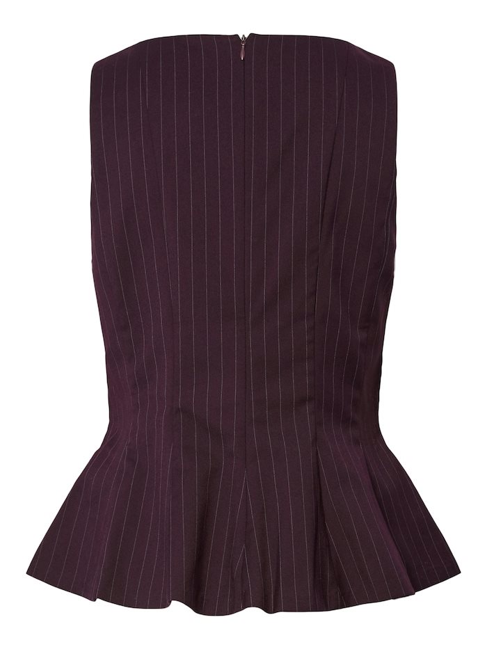 Fed top i en smuk bordeaux farve med klassisk nålestribet mønster. Designet med flæsekant forneden, der tilføjer et feminint touch. Tæt siddende pasform over overkroppen, som fremhæver figuren, og praktisk lynlåslukning i nakken for et elegant look.