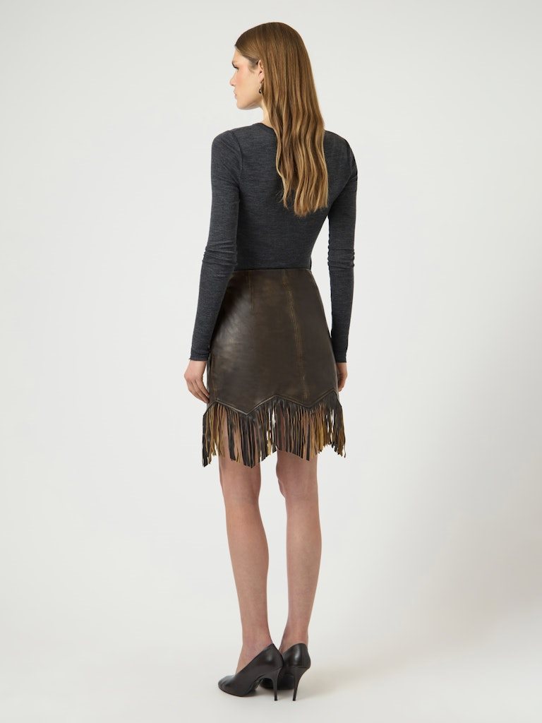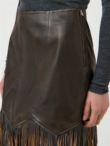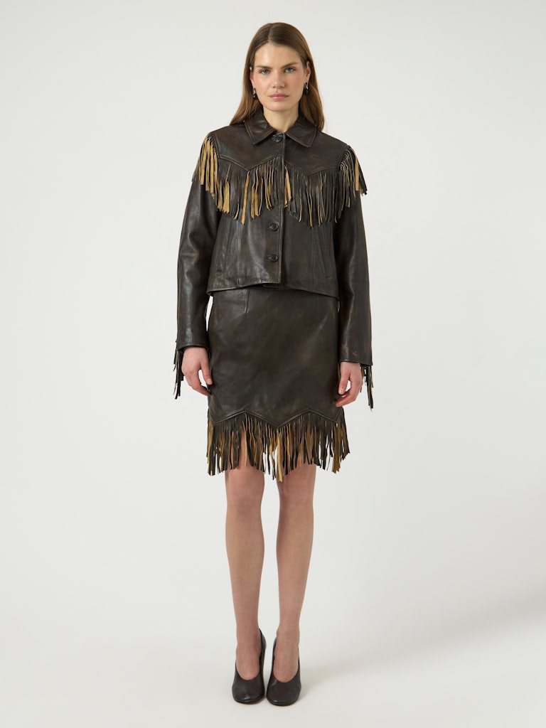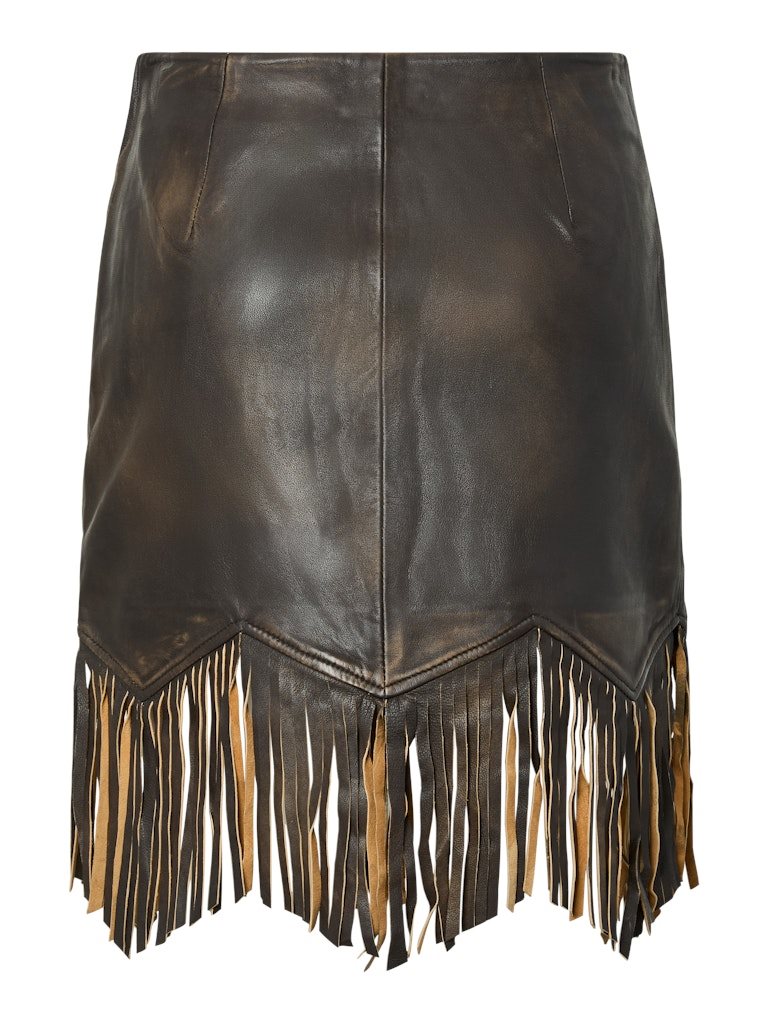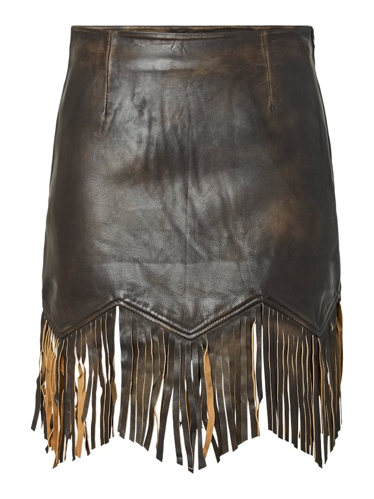 Cool og karakterfuld frynsenederdel i eksklusivt lammeskind. YAS FIMU HW Leather Skirt er designet i en dyb mahogni-brun nuance, der tilfører varme og kant til garderoben. De markante frynsedetaljer langs kanten skaber bevægelse og giver nederdelen et moderne boheme-inspireret udtryk.