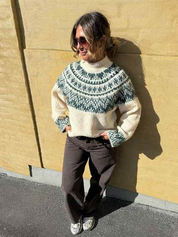 Strikken er fremstillet i en blød og varm uldblanding med alpaca, hvilket gør den både behagelig og holdbar. Med sit løse fit er den nem at style – perfekt over både jeans, skindbukser eller en nederdel til efteråret og vinteren.