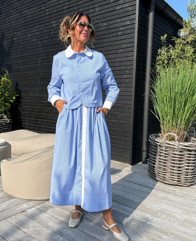 Den højtaljede pasform med behagelig elastik i livet fremhæver taljen og sikrer optimal komfort – uanset om du bruger den til hverdag, arbejde eller fest. Det lette materiale (70% bomuld, 27% nylon, 3% elastan) gør den til den perfekte sommernederdel, som både er åndbar og har et flot fald.