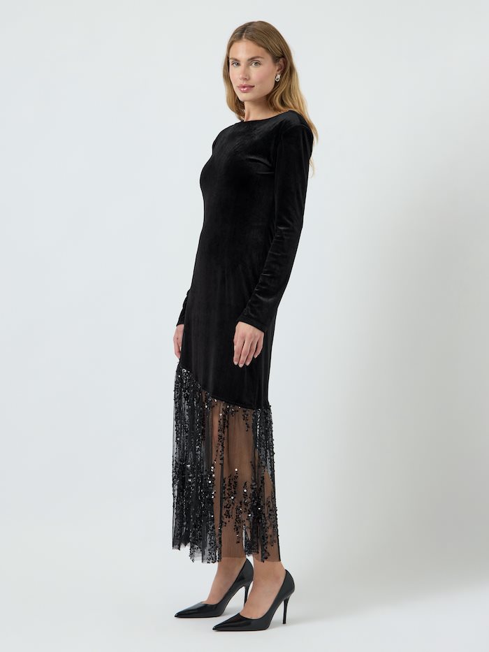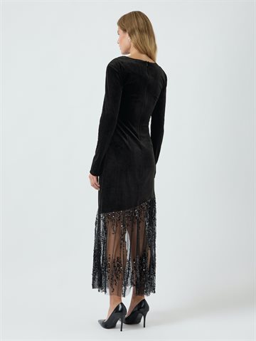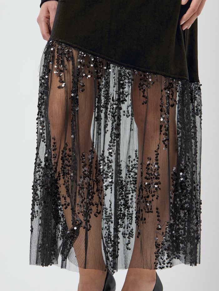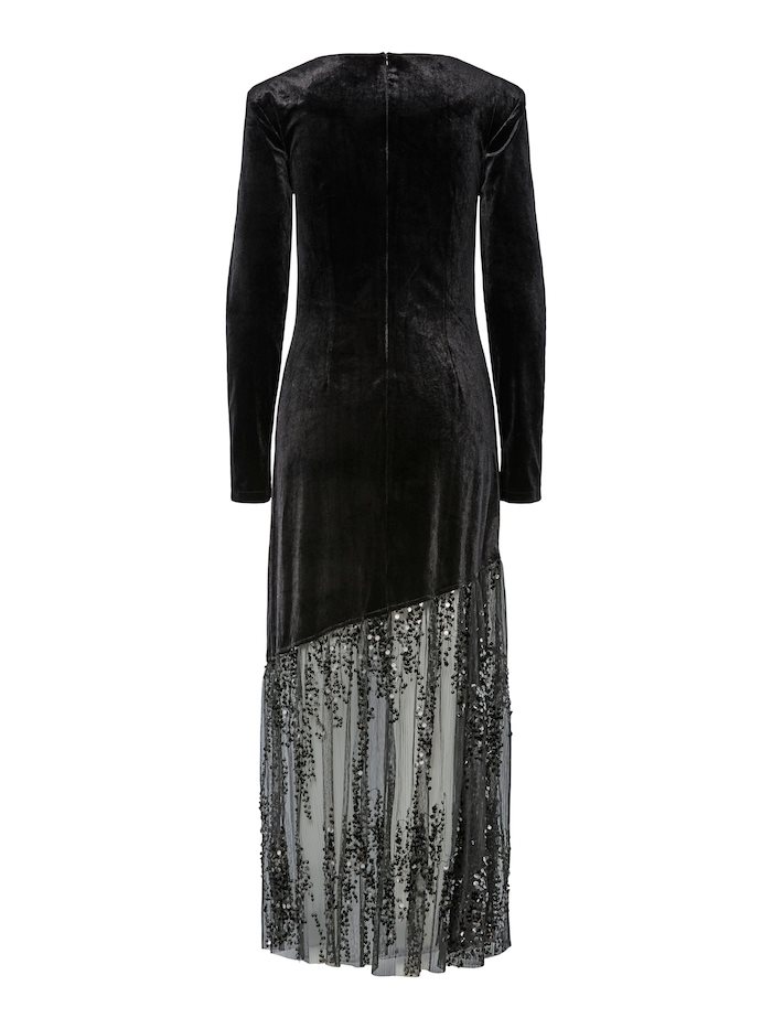 Kjolen har et sofistikeret og moderne udtryk med lange ærmer, en fløjlsagtig overdel og et transparent tylskørt dekoreret med smukke palietter.