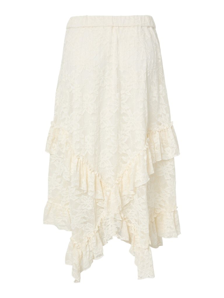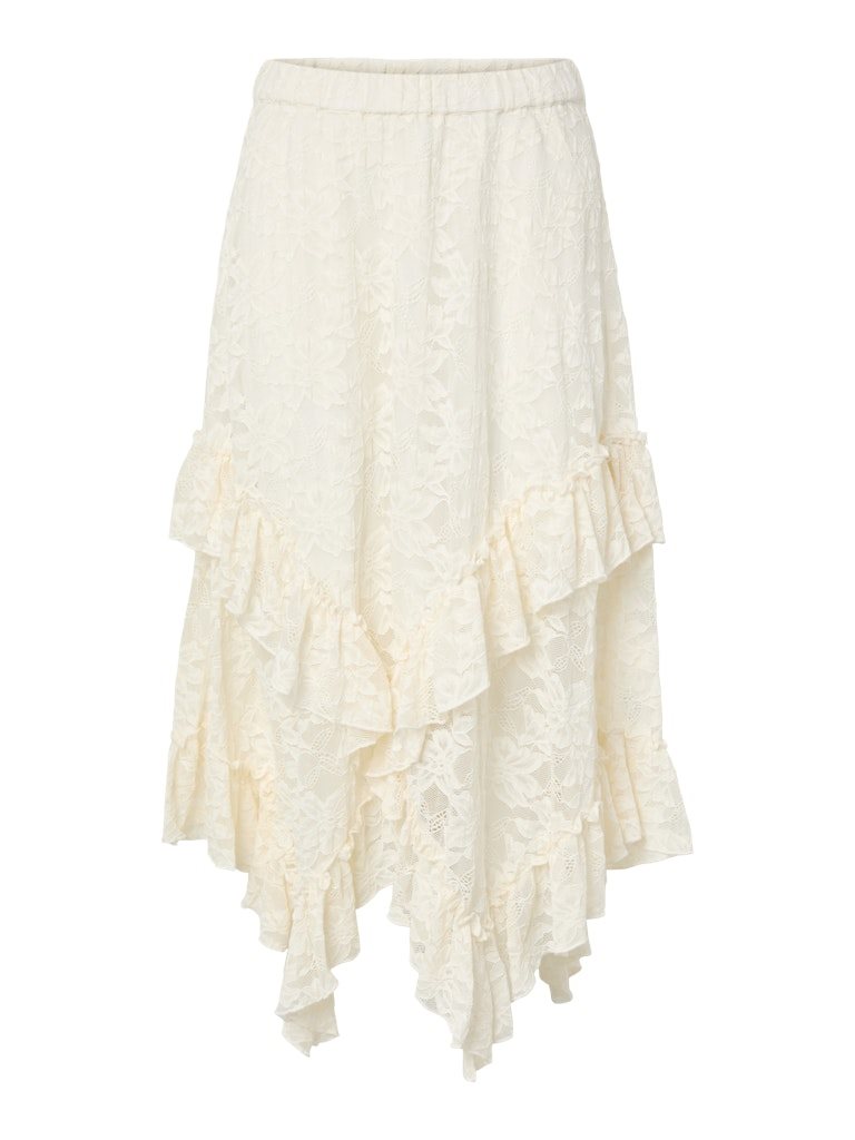 Skab et feminint og iøjnefaldende look med Y.A.S Tukka HW Ankle Skirt i Pristine – en smuk blondenederdel perfekt til både festival og sommerens events.
