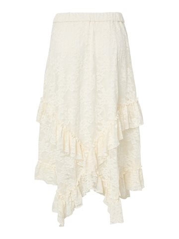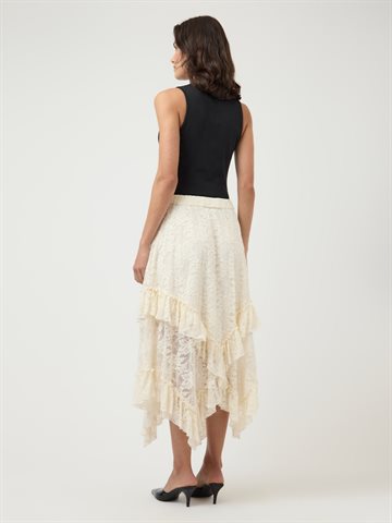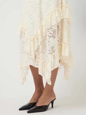 Nederdelen er designet i en elegant blondekvalitet, der giver et let og eksklusivt udtryk. Den høje talje og elastikkanten sikrer en komfortabel og flatterende pasform, mens længden til anklen skaber en sofistikeret silhuet.