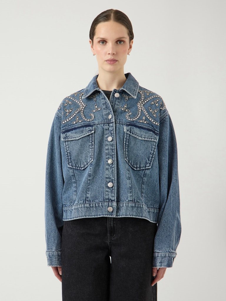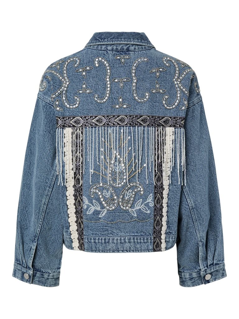 Det, der virkelig gør denne jakke unik, er de iøjnefaldende detaljer. På ryggen finder du dekorative perlefrynser, som tilfører et eksklusivt og feminint twist til det rå denimlook. Kombinationen af det klassiske snit og de kreative embellishments gør jakken perfekt både til hverdag og til at løfte et simpelt outfit.
